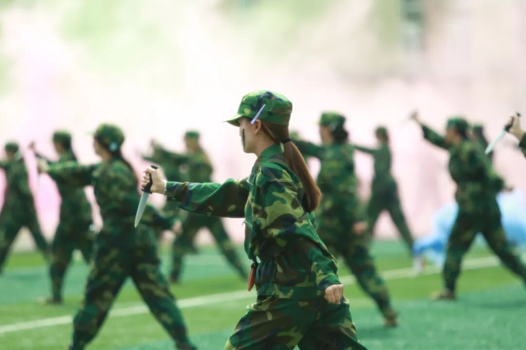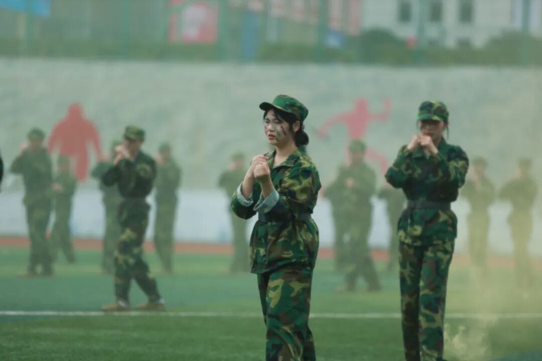 伴随着雄壮的国歌声,2025级学生国防教育思政课汇报正式开始。成果汇报环节,同学们闻令而动、身着戎装、身姿挺拔、眼神坚定,以一场震撼的表演,充分展示了军训成果和新时代青年学生的自信与风采。雄壮豪迈的中国人民解放军军歌奏响,各军训方阵迈着整齐划一的步伐、喊着铿锵响亮的口号,依次昂首通过主席台,接受全体师生的检阅。各方队特色鲜明、气势拉满:战术方队动作利落、协同默契,尽显实战素养;擒敌拳方队出拳刚劲、落地有声,气场磅礴震撼;刺杀操方队劈刺威猛、杀气腾腾,尽显军人血性;匕首操方队英姿飒爽、眼神锐利,满含昂扬斗志;军体拳表演刚劲有力,同学们以昂扬斗志交出军训优秀答卷。