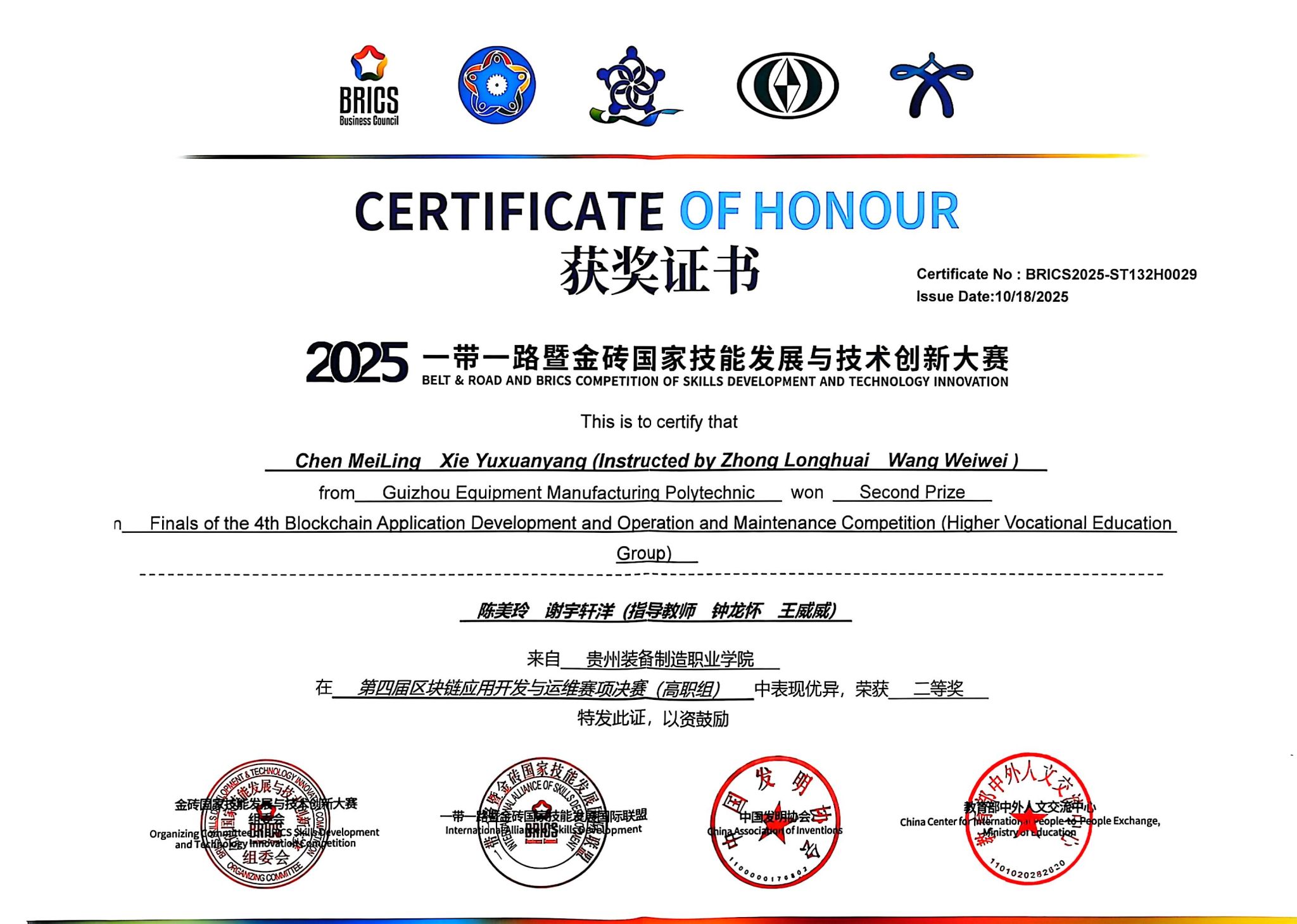 10月18日,2025一带一路暨金砖国家技能发展与技术创新大赛区块链应用开发与运维赛项全国总决赛落下帷幕。我校学子在比赛中表现出色,由龙权、王海军老师指导的团队荣获金奖,钟龙怀、王威威老师指导的团队斩获银奖。