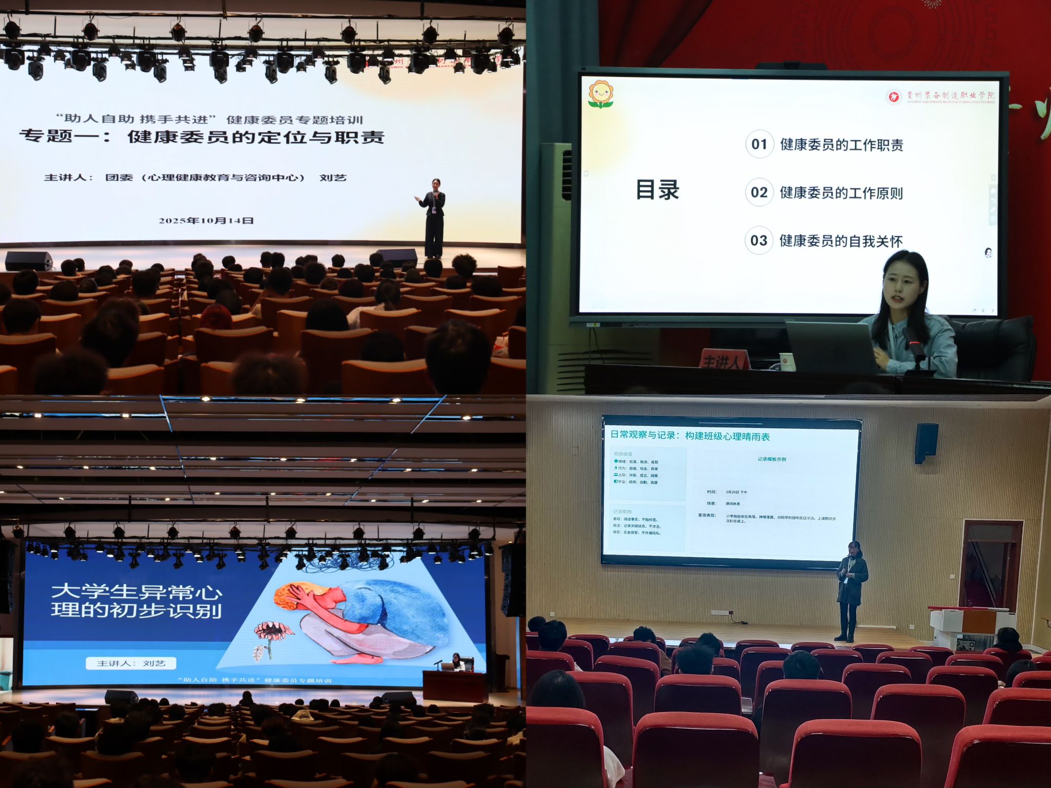 为提升我校健康委员的助人能力与责任意识,夯实“学校—系部—班级—宿舍”四级心理预警网络,团委(心理健康教育与咨询中心)于10月14日至10月28日组织开展了“助人助心 携手共进”健康委员专题培训,本次培训共开展四场专题课程,内容涵盖角色职责、心理问题识别、朋辈倾听技巧与危机干预流程等内容。2024级、2025级全体健康委员参加了本次培训,培训过程中,健康委员们认真听讲、积极互动,进一步明确了自身在班级心理健康教育工作中的定位与使命,为后续开展班级心理互助工作奠定了坚实基础。