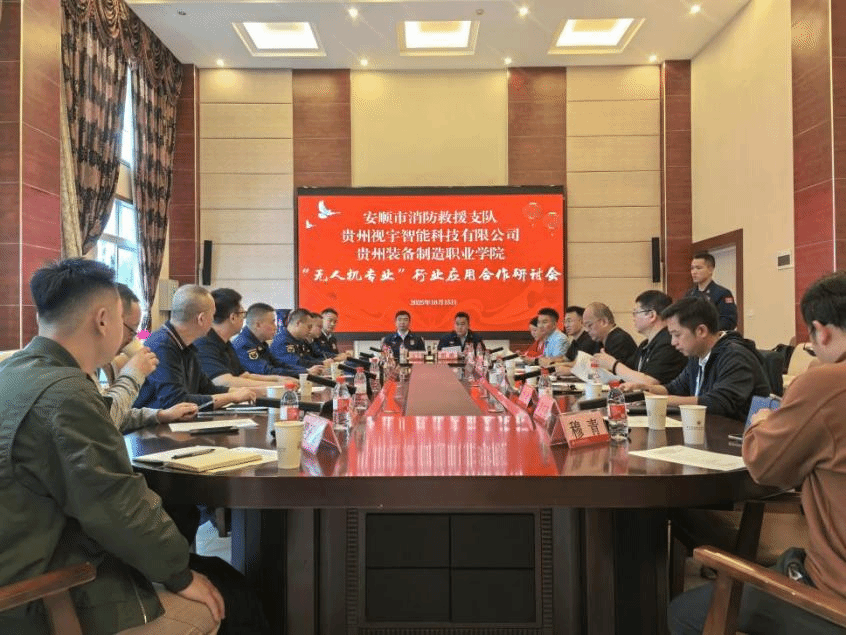 近日,安顺市消防救援支队、贵州视宇智能科技有限公司应邀来到我校就无人机应用技术的人才培养、行业应用开展合作交流。此次交流活动在学院知行楼贵宾厅举行,学院党委委员、副院长孙宁岗,电气工程系党总支书记刘忠翔、教务处处长饶应明、建筑系主任刘洋及无人机应用技术专业骨干教师参与座谈。