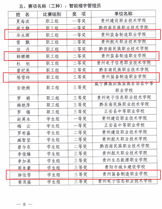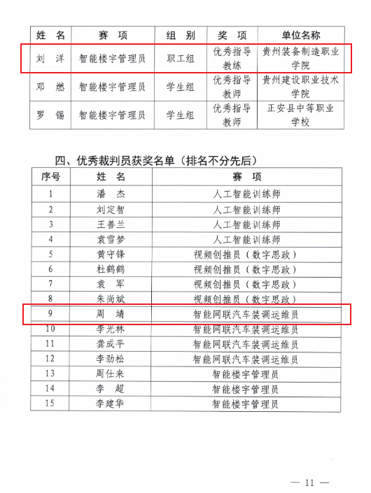 梁日荣、陈倩两位老师在人工智能训练师赛项职工组分别荣获二等奖、三等奖。学生关雯中在该赛项学生组荣获三等奖;学生刘梦婷在视频创推员(数字思政)赛项学生组荣获三等奖;学生张弛在焊接设备操作工赛项学生组荣获二等奖;学生漆恩怀在智能网联汽车装调运维员赛项学生组荣获二等奖;毕永辉、韩娜娜、陈雪玲三位老师在智能楼宇管理员赛项职工组分别荣获一等奖、二等奖、三等奖。学生钟佳雪在该赛项学生组荣获三等奖;刘洋老师获优秀指导教练;周靖老师获优秀裁判员。