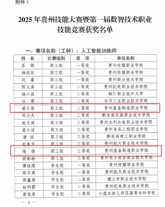 在贵州省大数据发展管理局、教育厅、人力资源和社会保障厅、总工会、共青团贵州省委五部门联合主办的“2025年贵州技能大赛暨第一届数智技术职业技能竞赛”中,我院师生团结协作、奋勇拼搏,凭借出色的专业能力与创新表现,在比赛中脱颖而出,荣获多项优异成绩,展现了学院良好的育人成效与师生昂扬的精神风貌