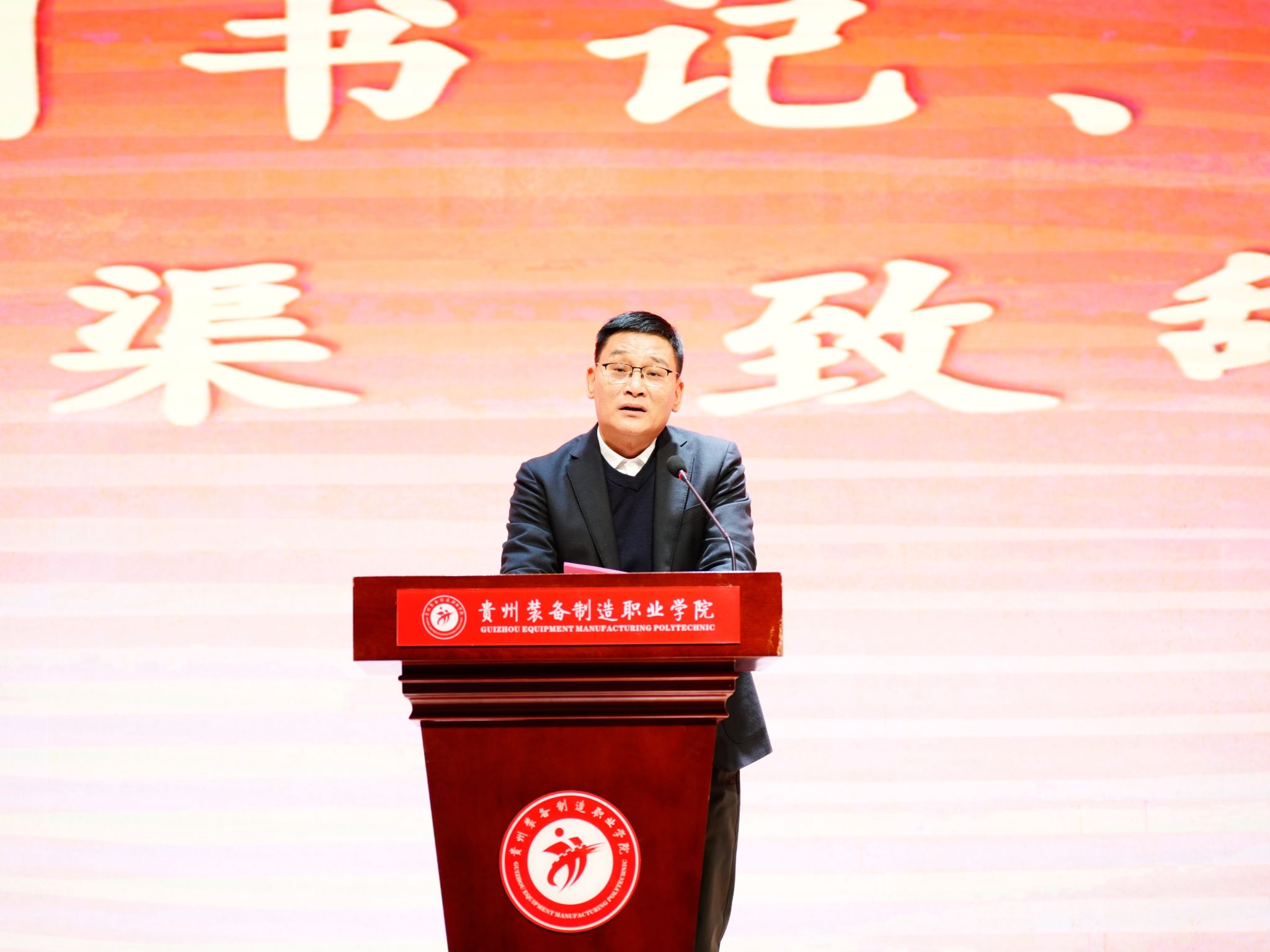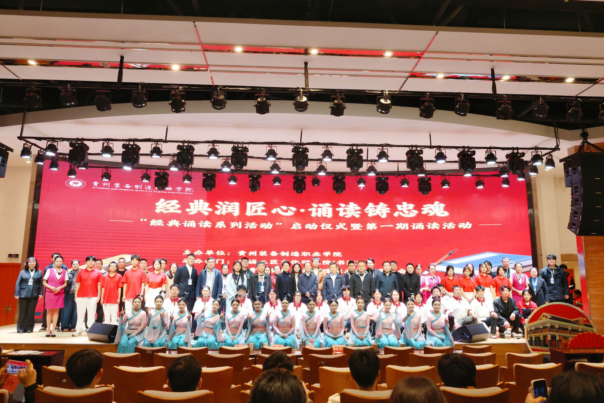 为深入贯彻落实习近平总书记视察学校的重要指示精神以及省委、省委教育工委关于推动“马院+书院”协同育人工作的部署安排,3月27日上午,贵州装备制造职业学院“经典润匠心·诵读铸忠魂”经典诵读系列活动启动仪式暨第一期诵读活动在德润楼105报告厅成功举办。活动特邀历史学研究员、国务院特殊津贴专家范同寿先生走进校园,与师生共读其著作《贵州历史笔记》。党委副书记、院长刘渠,党委副书记李峥嵘,党委委员、副院长孔杰出席活动,各党总支书记,党政办、宣传统战部、纪检监察室、马克思主义教学部、学生处等部门相关负责人,忠诚工匠文化研究院(书院)及团委全体成员,全体思政课教师,各系辅导员代表、学生代表等400余人参加。活动由书院负责人、团委书记孙文主持。