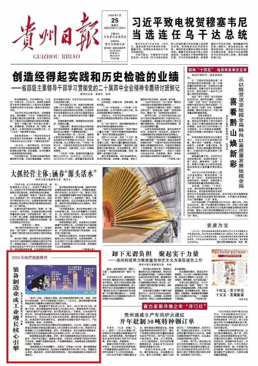 装备制造,国之重器。目前,贵州先进装备制造业已经形成了以航空、航天、汽车产业为重点,涵盖电力装备、工程及矿山机械等门类相对齐全的产业体系,随着产业链条活起来、产业集群强起来,装备制造业正挺起发展“新脊梁”。