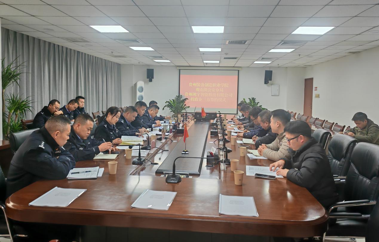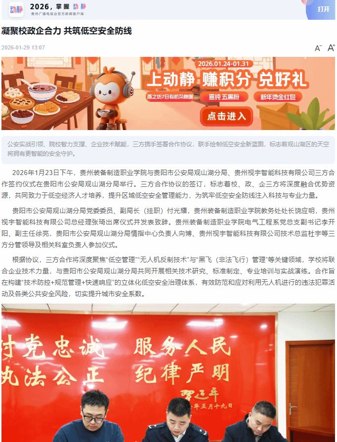2026年1月23日下午,贵州装备制造职业学院与贵阳市公安局观山湖分局、贵州视宇智能科技有限公司三方合作签约仪式在贵阳市公安局观山湖分局举行。三方合作协议的签订,标志着校、政、企三方将深度融合优势资源,共同致力于低空经济人才培养,提升区域低空安全管理能力,为筑牢低空安全防线注入科技与专业力量。