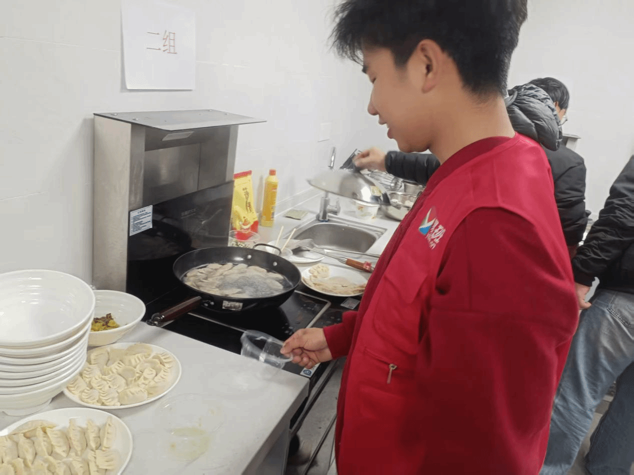 和面、擀皮、调馅……在包饺子区域,同学们手法虽略显生疏,但热情高涨,一个个形态各异的饺子在手中诞生,寓意着生活的百味与团圆的喜庆。在煮汤圆的锅边,热气腾腾的汤圆在沸水中翻滚,圆润饱满,象征着对新一年学业与生活圆满的美好祝愿。更有擅长烹饪的同学大展身手,起锅烧油,颠勺翻炒,一道道色香味俱全的炒菜陆续出锅,赢得了现场阵阵掌声与赞叹。